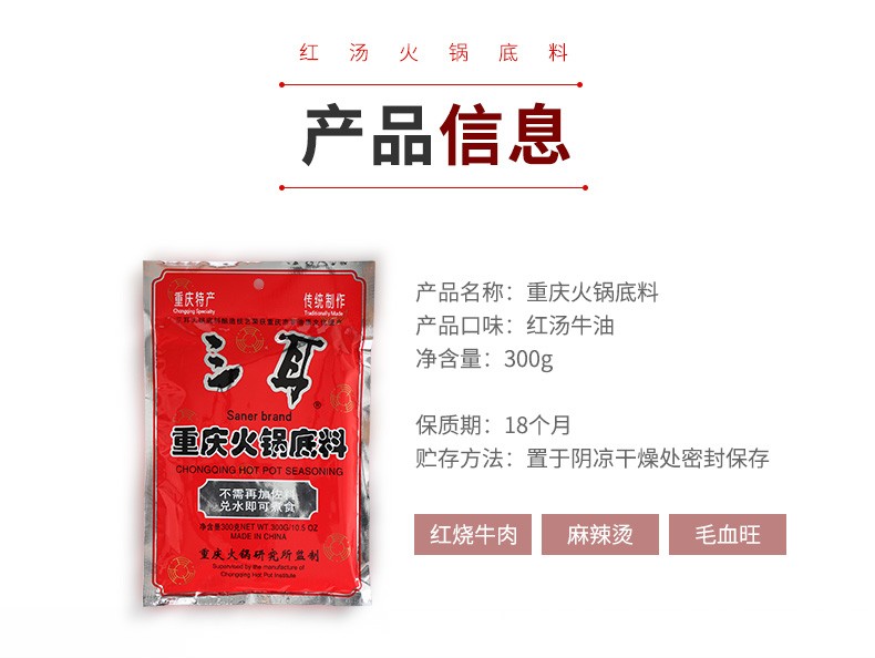 • 三耳 重庆火锅底料300g麻辣烫串串香麻辣香锅冒菜调味料