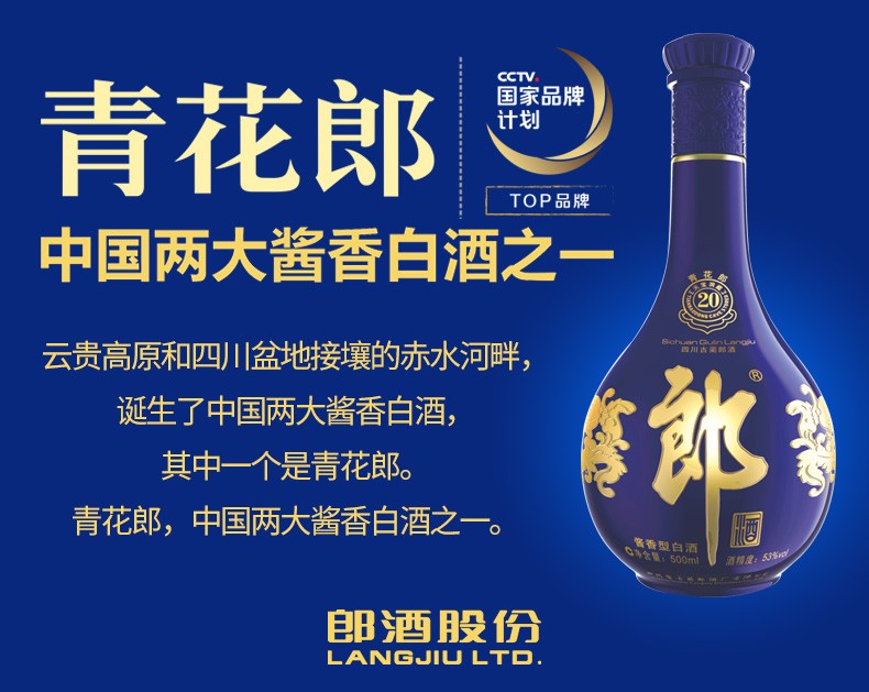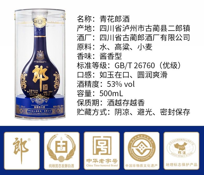 • 郎酒 青花郎二十(20)非20年53度酱香型白酒 500ml单瓶白酒
