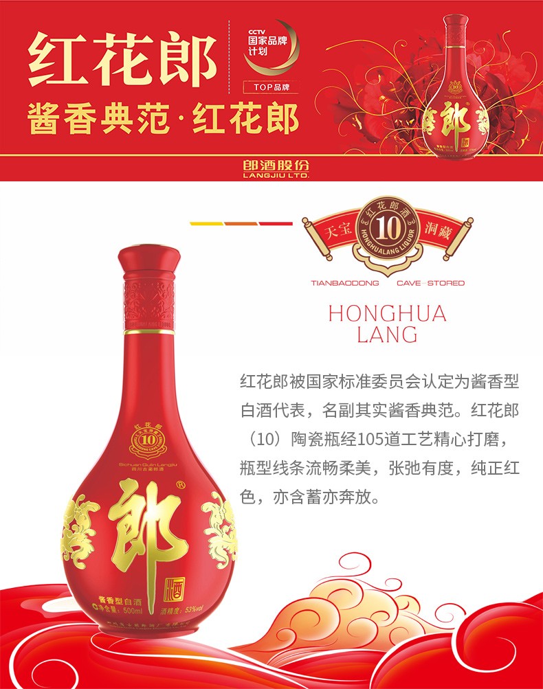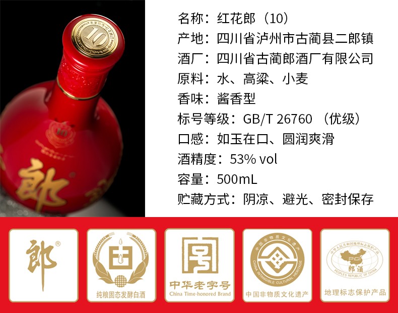 • 郎酒 红花郎十(10) 陈酿 53度 单瓶装白酒 500ml 酱香型