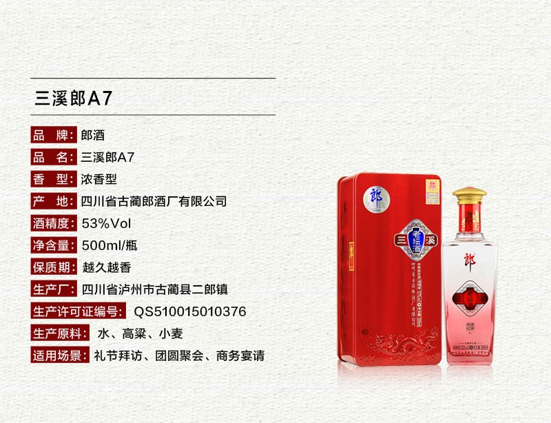 • 郎酒 三溪老坛A7贵字号坛 白酒 52度 浓香型 500ml