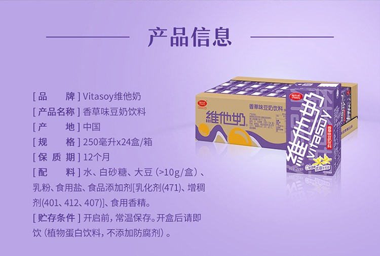 • 维他奶 香草味豆奶 植物蛋白饮料 250ml*24盒 整箱装