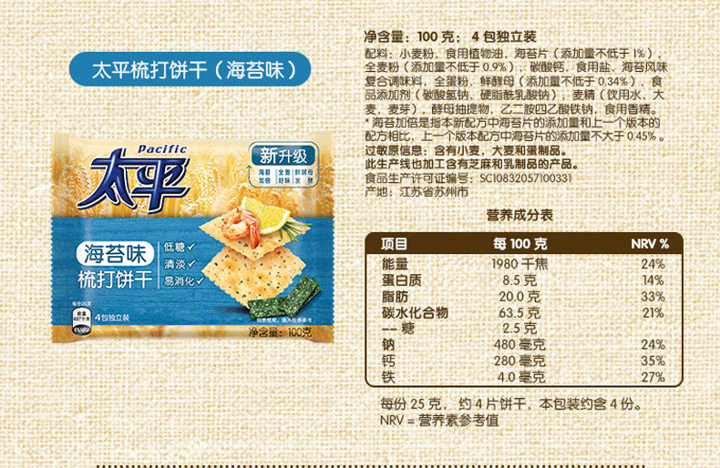 • 太平 海苔味 苏打梳打饼干 办公室零食小吃 100g 休闲零食