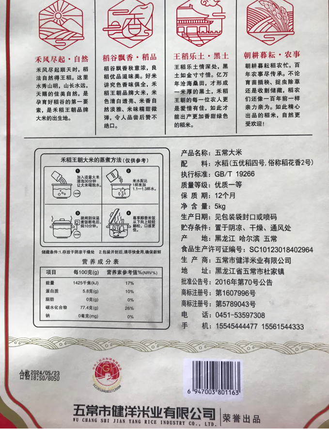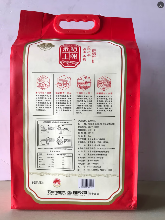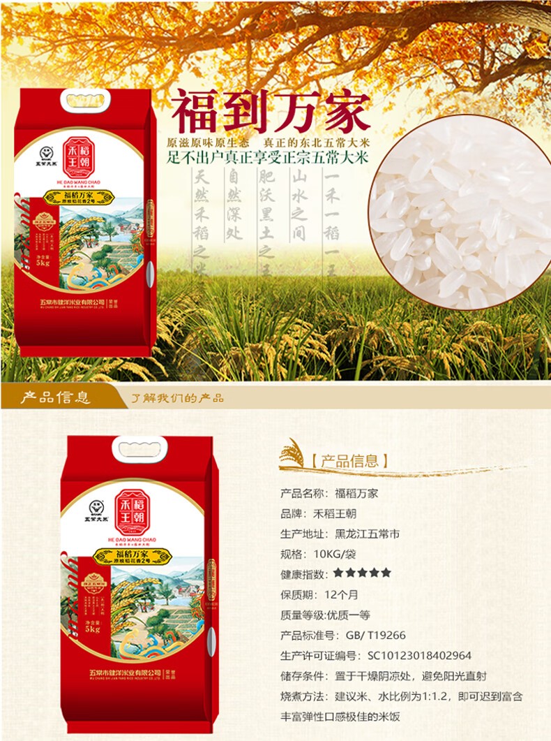 • 禾稻王朝 5kg 纯正五常米 福稻万家 优质一等五常大米 真空包装 健洋米业