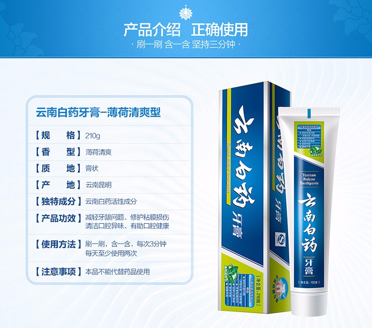 • 云南白药牙膏 薄荷清爽型 230g 减轻牙龈问题 祛异味