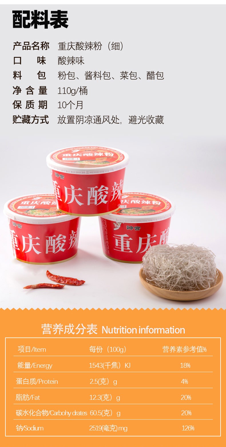 神宫 正宗重庆酸辣粉 桶装速食粉丝方便面 农家红薯粉条 110g