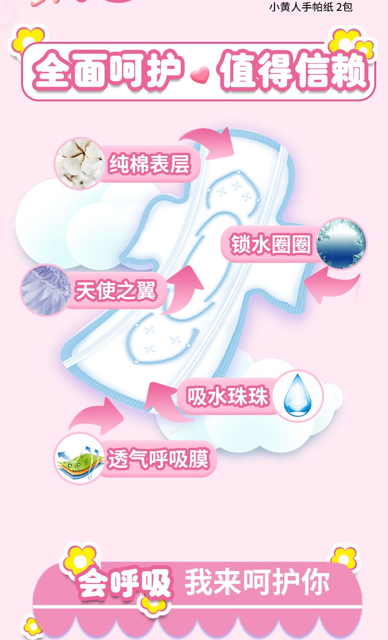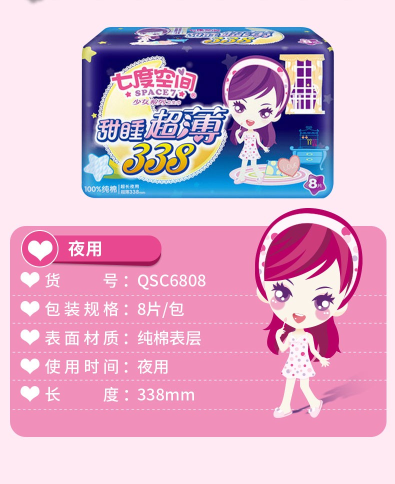 七度空间卫生巾 超长夜用超薄纯棉姨妈巾 338mm/8片正品