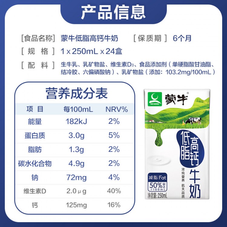 蒙牛 低脂高钙牛奶 250ml*24 礼盒装