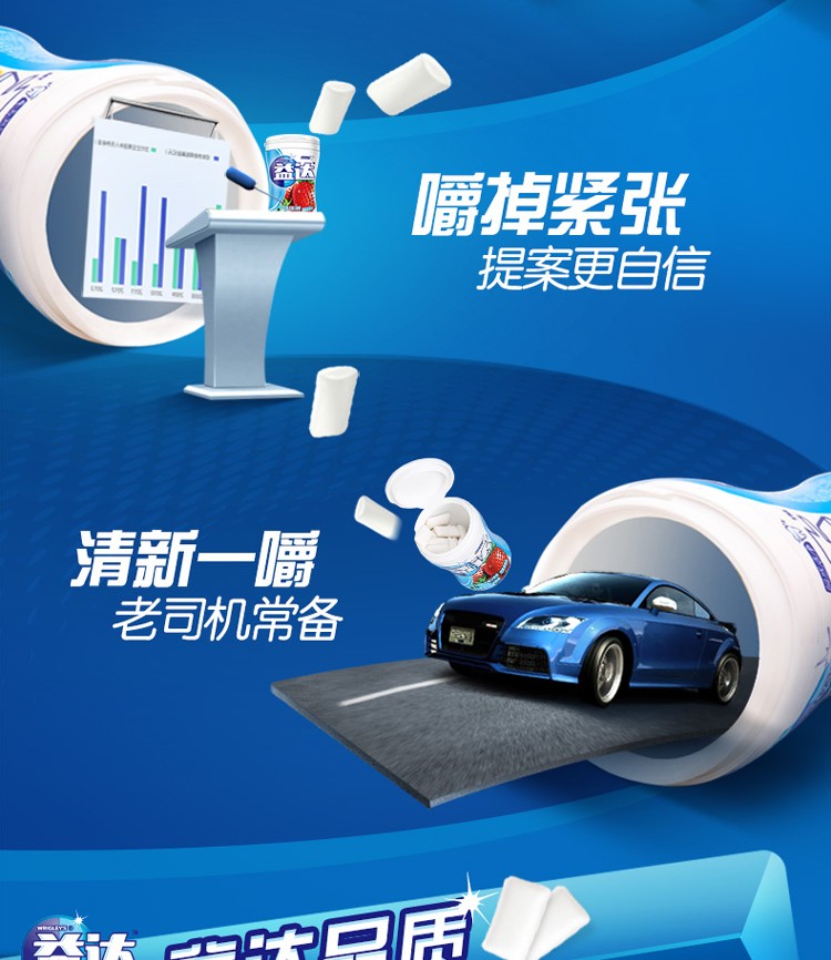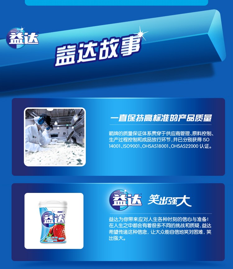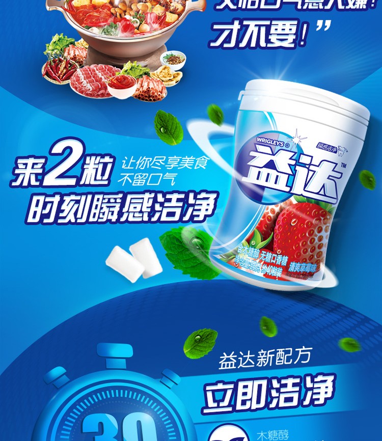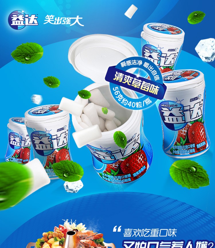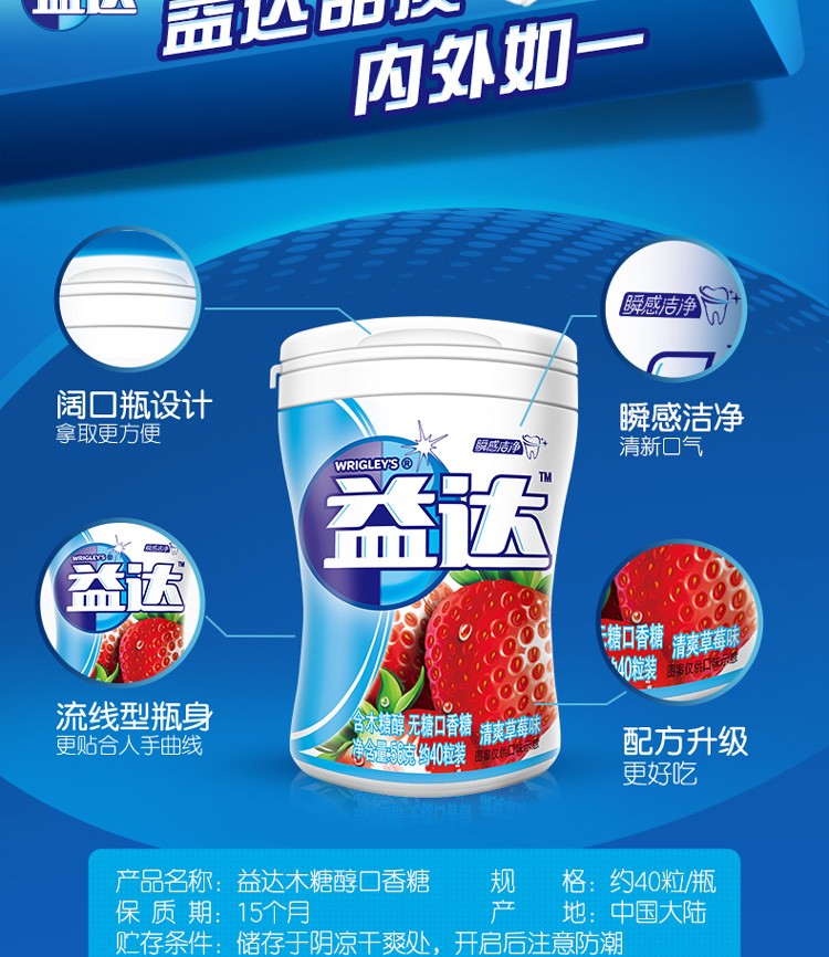 益达 木糖醇无糖口香糖清爽草莓40粒56g 单瓶装