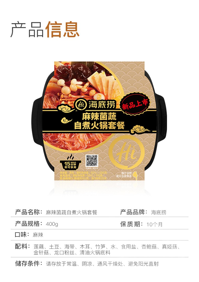 海底捞 麻辣菌蔬自热火锅 400g 方便速食 自热食品火锅套餐