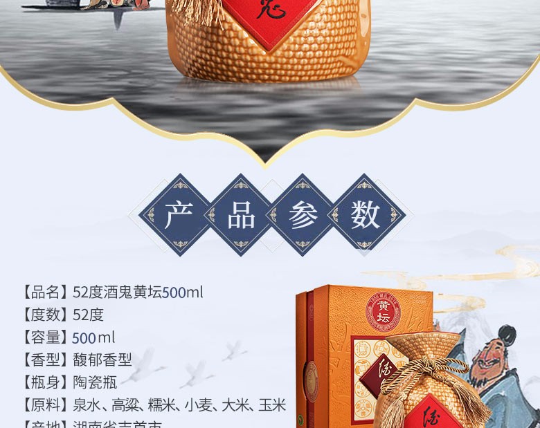 酒鬼 白酒 黄坛 52度500ml 馥郁香型 白酒礼盒 陶瓷瓶 酒鬼酒