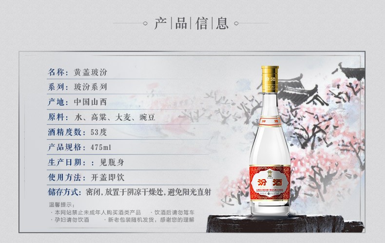 汾酒 黄盖玻汾 53度 475ml/瓶 清香型 高度白酒