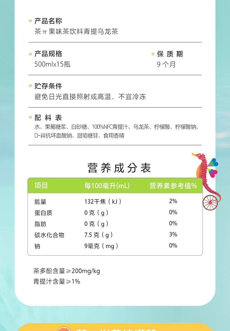 茶派 青提乌龙茶 500ml/15瓶 茶π饮料 整箱 农夫山泉