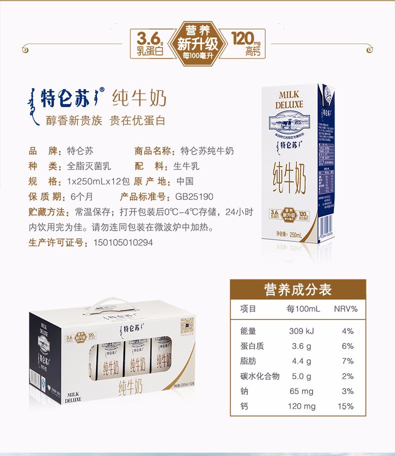 蒙牛 特仑苏纯牛奶250ml*12盒整箱